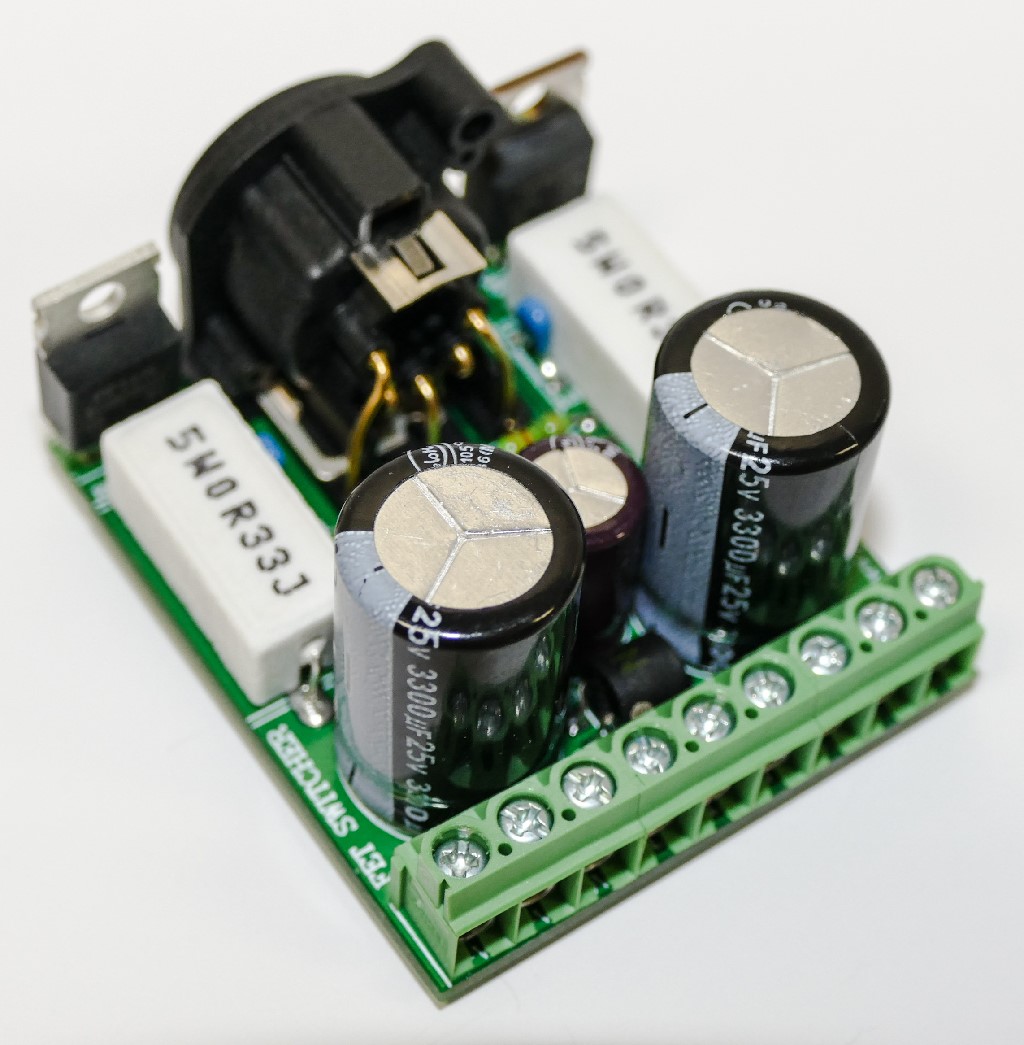 FET POWER SWITCHER Kit with PCB & PCb parts is used with our +/-16v@2A & +48v@120mA 65w SMPS power supply to give a simple single pole power switch that turns on the +/-16v and 48v with soft start using high current fets.